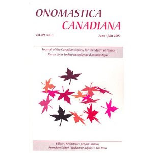 Onomastica Canadiana, the official journal of the Canadian Society for the Study of Names / Société canadienne d’onomastique (CSSN / SCO), is now inviting submissions in English or French for Volume 96 (2017). Papers in any area of onomastics are welcomed, including (but by no means limited to) studies of place names, personal names, brand names, literary/fictional names, and indigenous names. Authors wishing to offer an article for publication in Onomastica Canadiana should visit the CSSN website to download the Contributors’ Guide, which contains information about the peer-evaluation process as well as stylistic recommendations. This material may also be obtained by e-mailing a request to onomastica.canadiana@gmail.com.