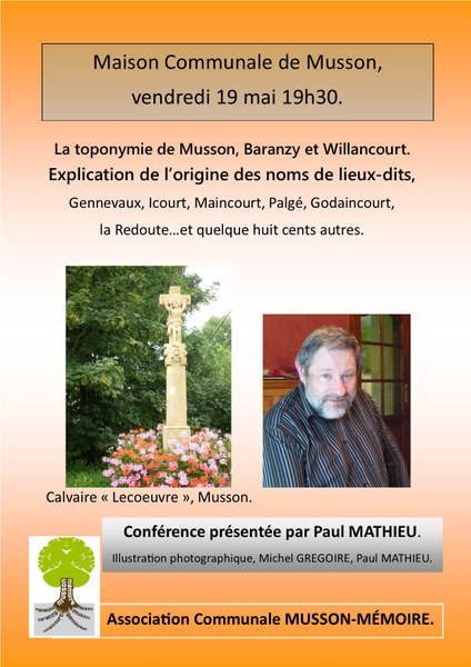 - Paul Mathieu présentera ses recherches sur la toponymie de Musson. La toponymie se définit comme étant l’étude des noms de lieux, de leur origine, des rapports avec la langue parlée actuellement ou avec des langues disparues. Quelle est l’origine des lieux-dits de Musson, Icourt, Maincourt, Palgé, Godaincourt, la Redoute… Les villages de Musson, Baranzy, Willancourt dénombre quelque huit cents toponymes…