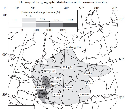 Prof. Balanovsky researched, inter alia, on geography of surnames. The method of the use of surnames as analogs of genetic markers is well known. It has been further developed and widely used by Russian researcher Oleg Balanovsky. He used surnames as quasi-genetic markers (the term coined by A. Revazov). Direct comparisonof the results obtained with the use of two types of markers, genetic and quasi-genetic, demonstrated that the use of surnames for studying the gene-pool structure can yield reliable results.